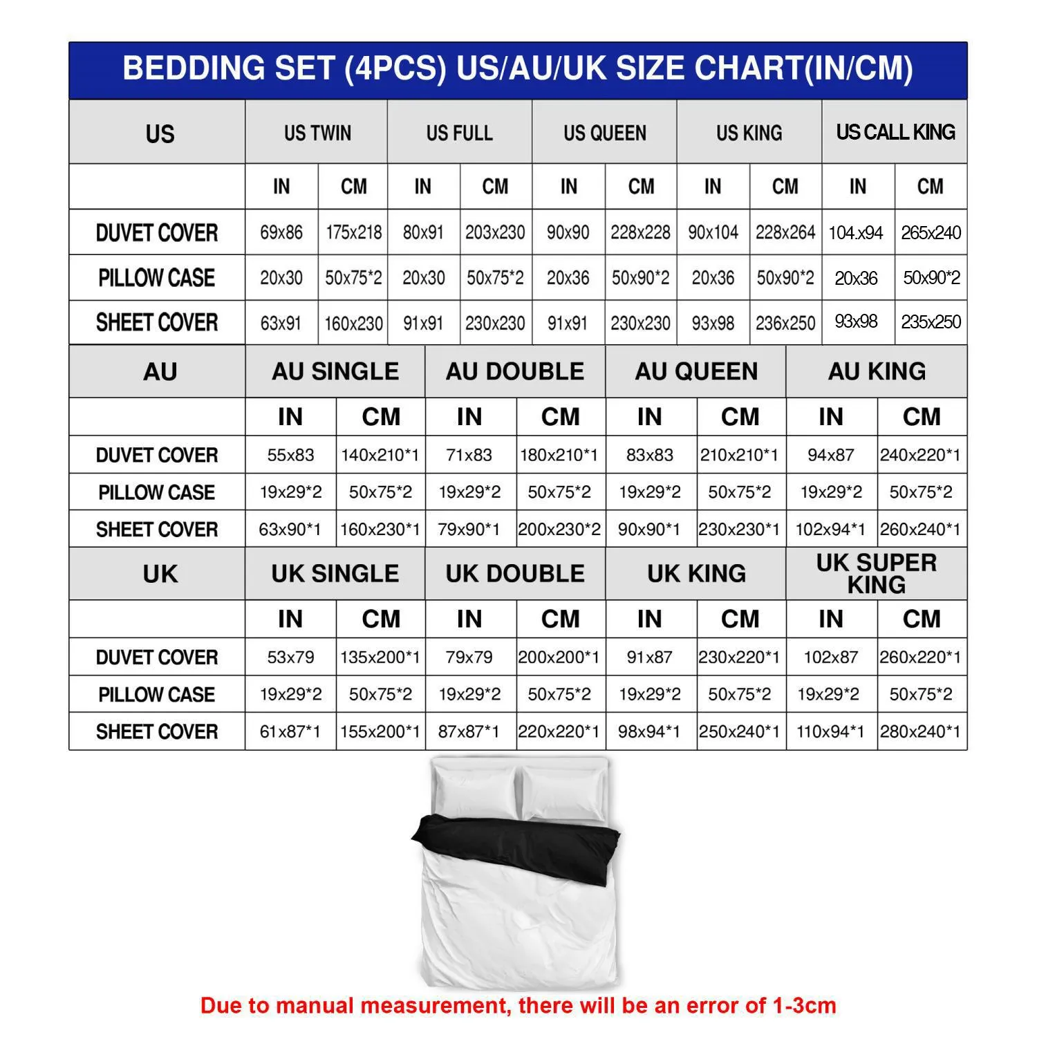 - US King: Duvet: 228 x 264 (cm), Pillowcases: 50 x 90 (cm), Sheet Cover: 235 x 250 (cm).